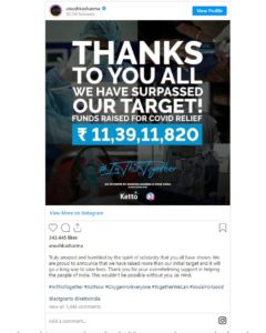 ਅਨੁਸ਼ਕਾ ਅਤੇ ਵਿਰਾਟ ਦੀ ਜੋੜੀ ਨੇ ‘ਹੈਸ਼ਟੈਗ ਇਨ ਦਿਸ ਟੂਗੇਦਰ’ ਪਹਿਲ ਦੀ ਸ਼ੁਰੂਆਤ ਕਰਾਊਡ – ਫੰਡਿੰਗ ਪਲੇਟਫਾਰਮ ਕੇਟੋ ਦੇ ਨਾਲ ਮਿਲਕੇ ਕੀਤੀ ਸੀ, ਜੋ ਇੱਕ ਫੰਡਰੇਜਿੰਗ ਪਲੇਟਫਾਰਮ ਹੈ। ਵਿਰਾਟ ਅਤੇ ਅਨੁਸ਼ਕਾ ਨੇ 7 ਮਈ ਨੂੰ ਮੁਹਿੰਮ ਸ਼ੁਰੂ ਕੀਤੀ ਸੀ। ਅਨੁਸ਼ਕਾ ਅਤੇ ਵਿਰਾਟ ਨੇ ਆਪਣੇ ਫੈਂਨਸ ਅਤੇ ਫਾਲੋਅਰਸ ਨੂੰ ਇਸ ਵਿੱਚ ਯੋਗਦਾਨ ਦੇਣ ਲਈ ਧੰਨਵਾਦ ਕਿਹਾ ਹੈ।ਇਸ ਕਪਲ ਨੇ 2 ਕਰੋੜ ਦੇ ਡੋਨੇਸ਼ਨ ਦੇ ਨਾਲ ਇਸ ਕੈਂਪੇਨ ਦੀ ਸ਼ੁਰੂਆਤ ਕੀਤੀ ਸੀ। ਉਨ੍ਹਾਂ ਨੇ ਭਾਰਤ ‘ਚ ਕੋਵਿਡ ਰਾਹਤ ਲਈ 7 ਕਰੋੜ ਰੁਪਏ ਇਕੱਠੇ ਕਰਨ ਦਾ ਟੀਚਾ ਰੱਖਿਆ ਸੀ।