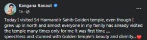 ਬਾਲੀਵੁੱਡ ਅਦਾਕਾਰ Kangana Ranaut ਪਹੁੰਚੀ ਹਰਮੰਦਿਰ ਸਾਹਿਬ,ਤਸਵਰਾਂ ਕੀਤੀਆਂ ਸਾਂਝੀਆਂ